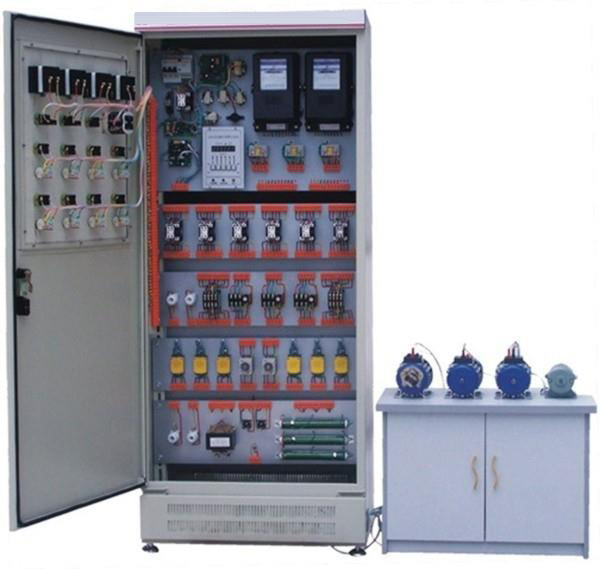 该装置按标准电气控制柜设计制造规格,充分利用双面位置,柜内装有完成各种照明电路所需的单相电度表、日光灯、单联开关、插座、感应开关、漏电开关等,以及电气控制所需要的多种低压电器,如漏电断路器、熔断器、电流互感器、交流接触器、时间继电器、热继电器、中间继电器、行程开关、按钮、信号灯、转换开关、电压表、电流表、功率表及电度表等,为了延长电器使用寿命,各电器的接点都与接线端子相连,再由接线端子与被控制电气连接。