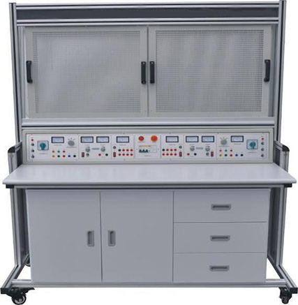 该实训装置主要由实训桌和网孔板组成。学生通过实训线路进行元器件的布局安装,接线全部由学生自行完成,有利于培养学生的动手能力和操作技能。实训项目可自行确定,根据所选的项目选择相应的元器件,也可作为电工考证的考核设备。