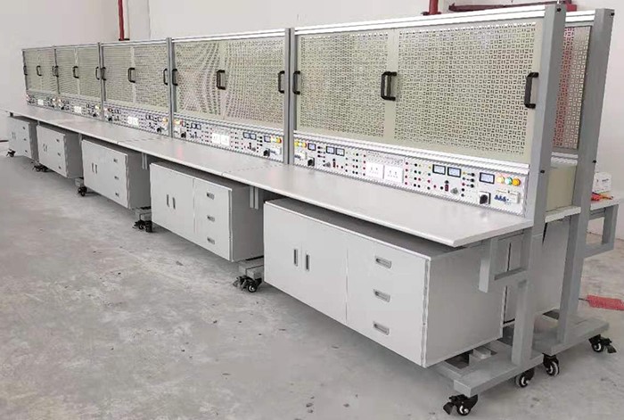 2、实训桌桌面采用25mm麻灰色高密度层压板封边特制,有效提高绝缘等级;实验桌底部装有至少4个导向轮,方便实训台架移动;