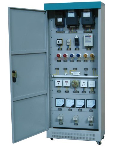 该装置按标准电气控制柜设计制造规格,充分利用双面位置,柜内装有完成各种照明电路所需的单相电度表、日光灯、单联开关、插座、感应开关、漏电开关等,以及电气控制所需要的多种低压电器,如漏电断路器、熔断器、电流互感器、交流接触器、时间继电器、热继电器、中间继电器、行程开关、按钮、信号灯、转换开关、电压表、电流表、功率表及电度表等,为了延长电器使用寿命,各电器的接点都与接线端子相连,再由接线端子与被控制电气连接。