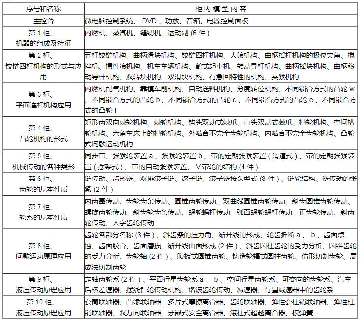 机械基础陈列柜共分十个柜和一个控制台,声控同步演示,采用单驱动由电脑或电子设备控制运转演示可由VCD控制顺序自动运行讲解,又能根据教材教学需要遥控任意选择进行单独演示。模型材料采用进口有机板制造,板面附有银涤纶不干胶作必要的图表和文字说明,演示形象逼真,运行可靠。