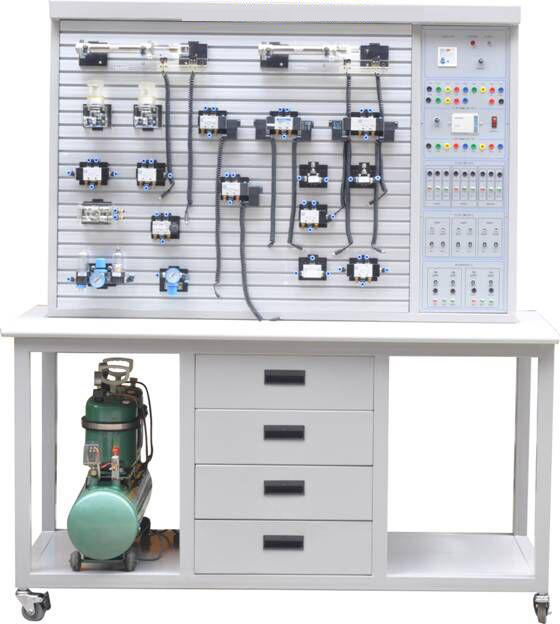 气动实训装置是应现代液压气动专业教学实验要求。根据《液压与气动传动》,《气动控制技术》等通用教材内容设计而成。该系统除了可以进行常规的气动基本控制回路实验外,还可以进行模拟气动控制技术应用实验,气动技术课程设计等。