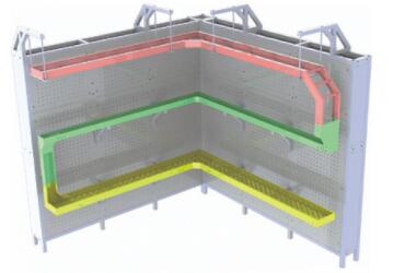 单层模拟墙桥架展示系统采用仿真管槽安装环境模型用200x60梯级桥架3米、100x50槽式桥架3米、100x50托盘式3米分上中下三层进行安装展示,配套有水平弯、三通、异径接头、堵头等配件