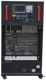 电气控制单元主要包含数控系统、进给驱动、主轴单元、刀架控制电路、冷却控制电路、接口单元、保护电路、电源电路等组成。该单元包含完整的数控车床电气控制部分,内嵌有数控机床智能化考核系统,以及接口转换单元,可以直接与数控机床功能部件进行连接用于真实的电气调试与维修实训;也可以通过接口转换单元和电气安装实训单元连接完成对数控机床功能部件的调试。立式结构符合真实的数控电气安装环境,器件布局与实际机床一致,符合GB/T5226.1-1996标准,可以更贴合实际岗位要求进行技能训练。